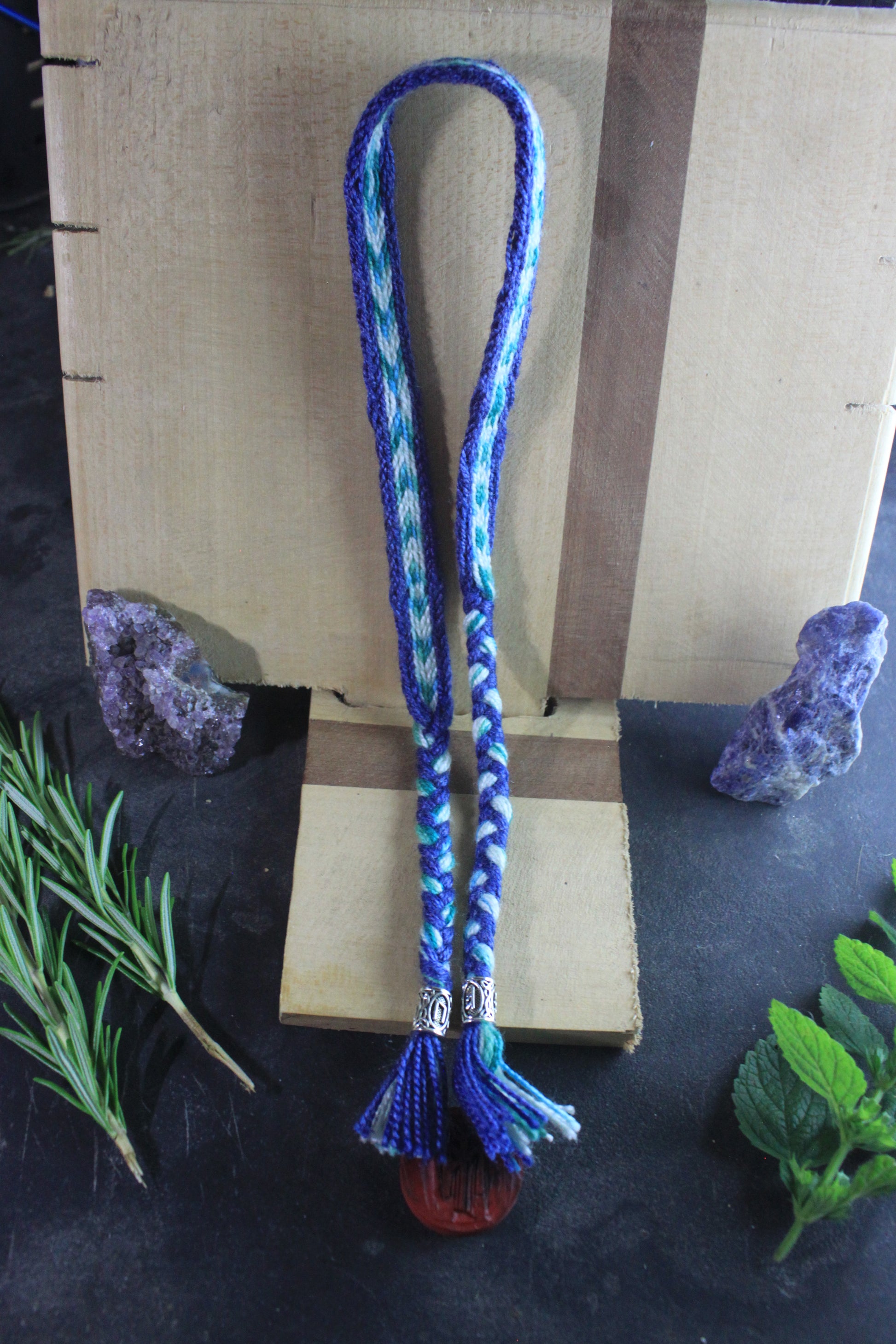 Chaque fil de ce bracelet unique, aux motifs complexes évoquant les vagues douces et les brises marines, a été tissé avec intention. Les teintes harmonieuses (bleu marine profond, vert émeraude, sable doré et blanc écume) rappellent les profondeurs océaniques, la vitalité des algues marines, la richesse des plages et la pureté de l'écume. Ce travail artisanal de tissage aux cartes, méthode païenne traditionnelle, imprègne ce bracelet d'une intention de stabilité émotionnelle, de prospérité matérielle et spirituelle, et de voyages empreints de calme et de sécurité.